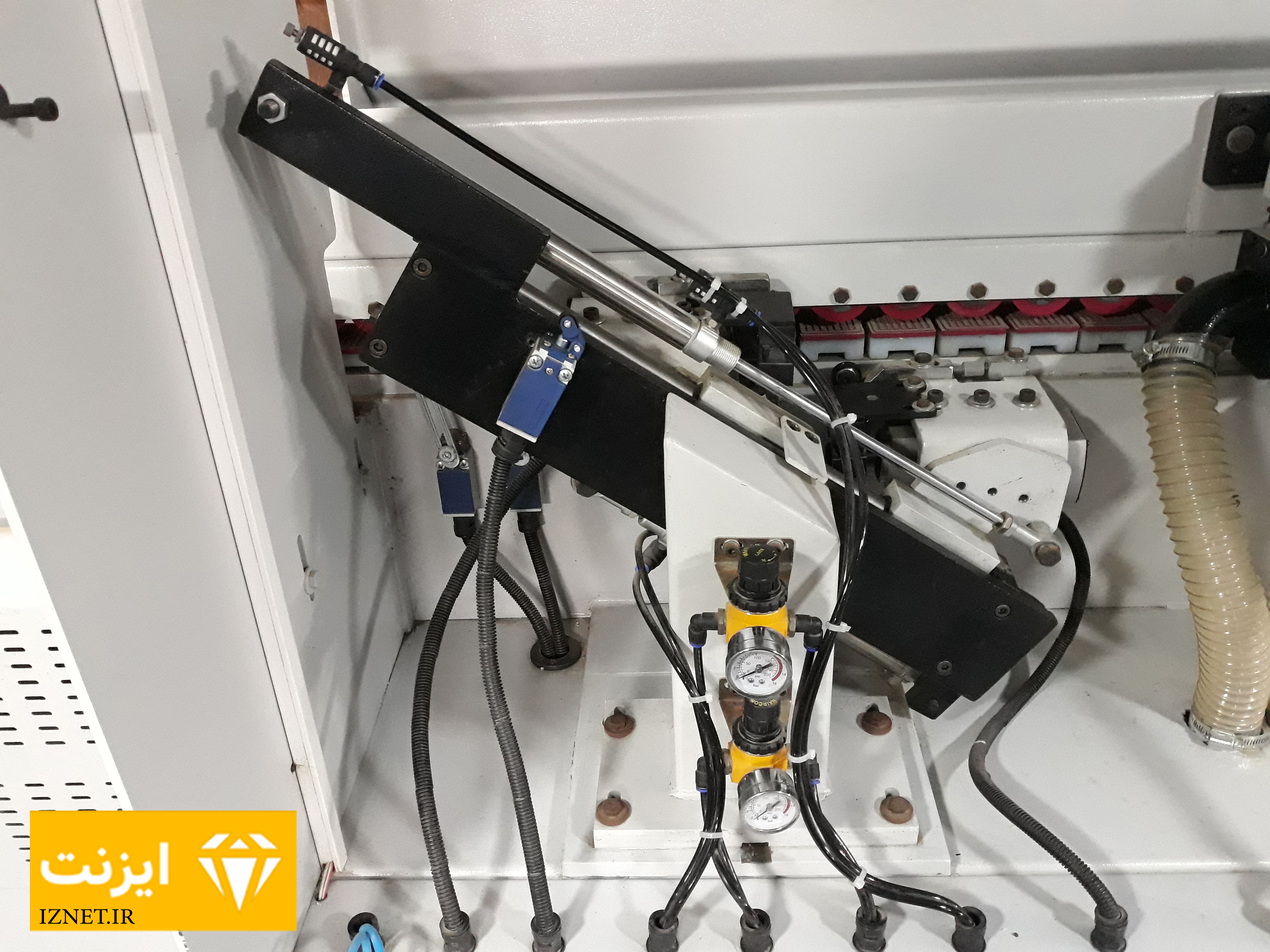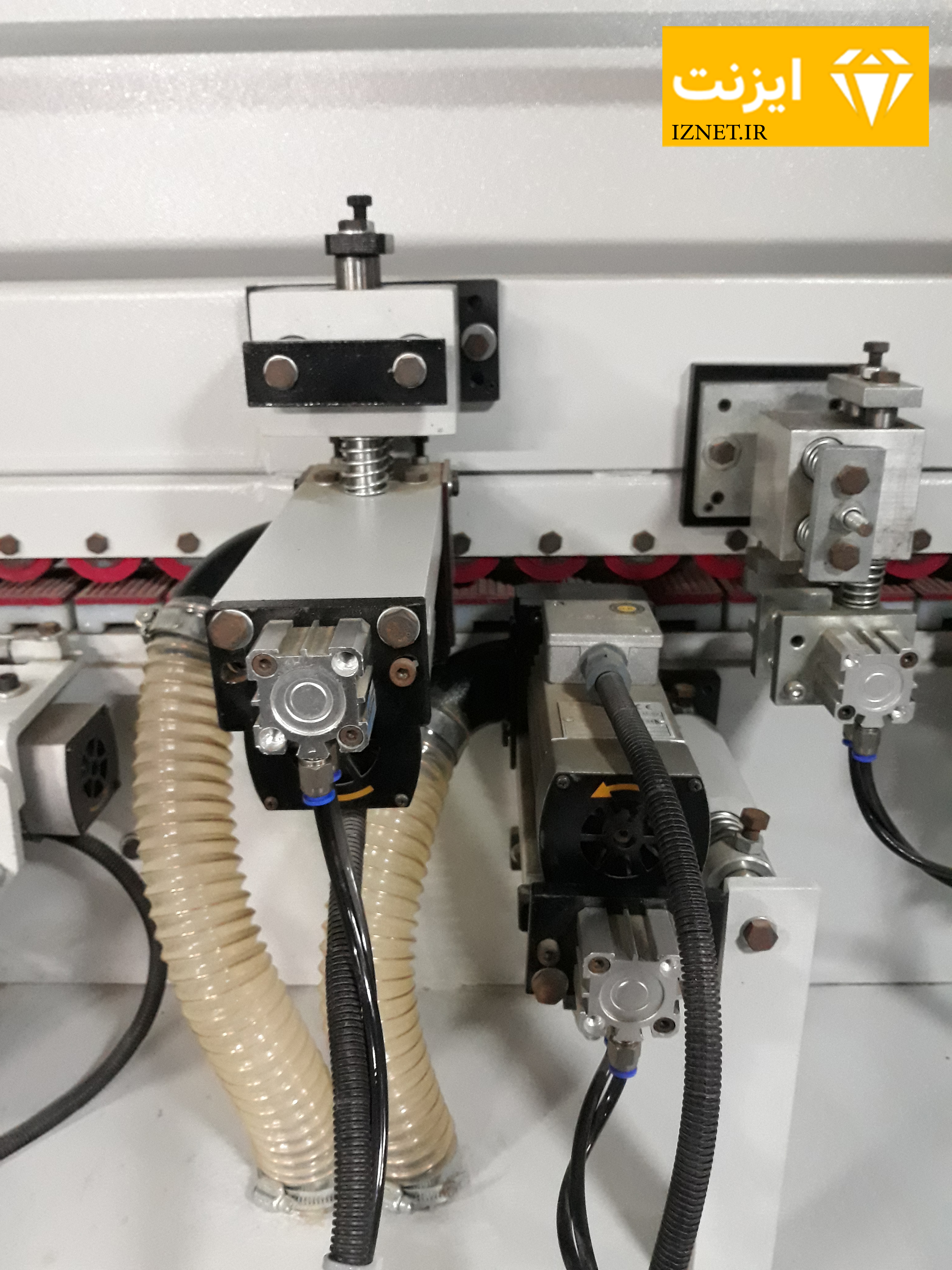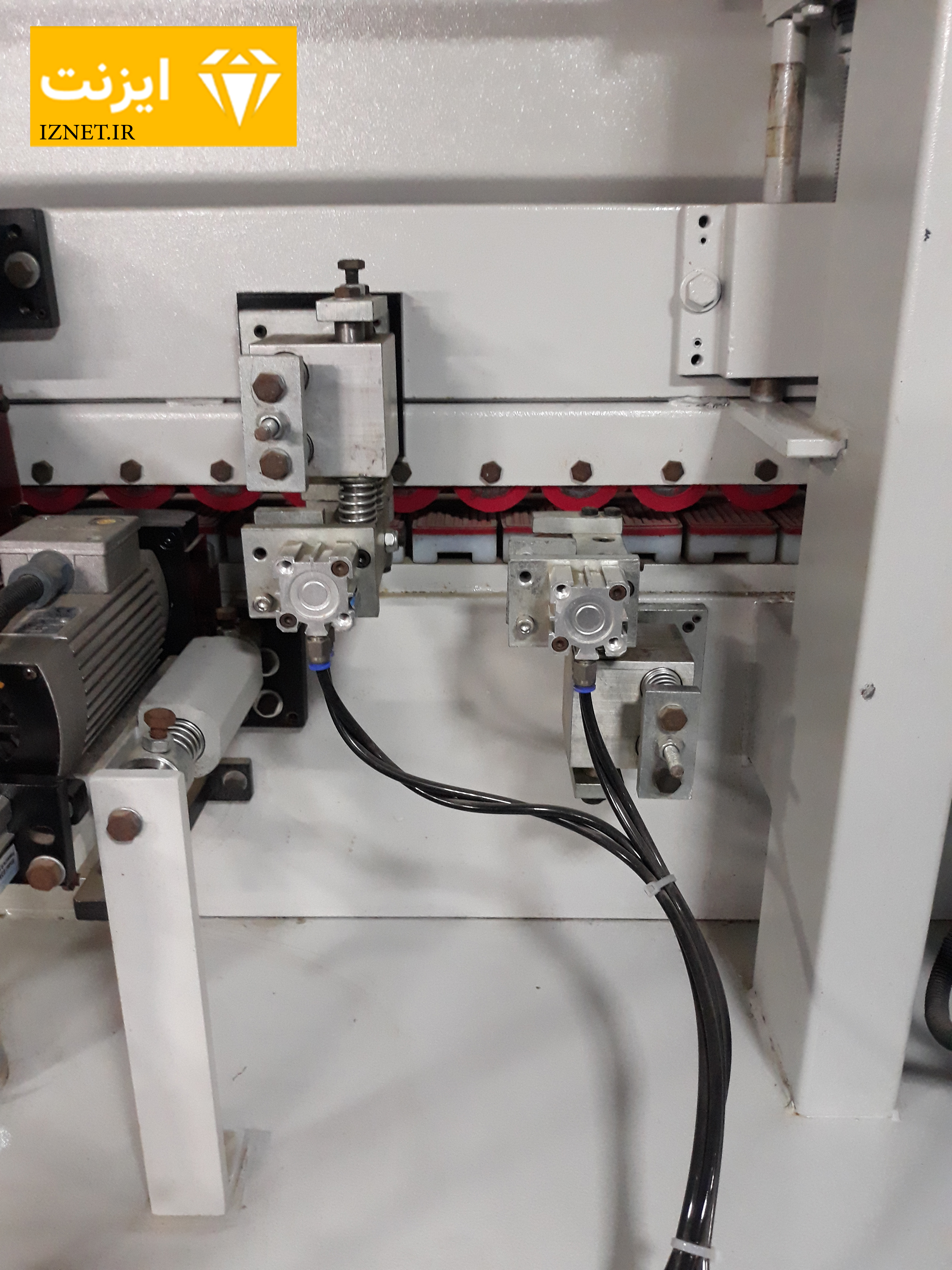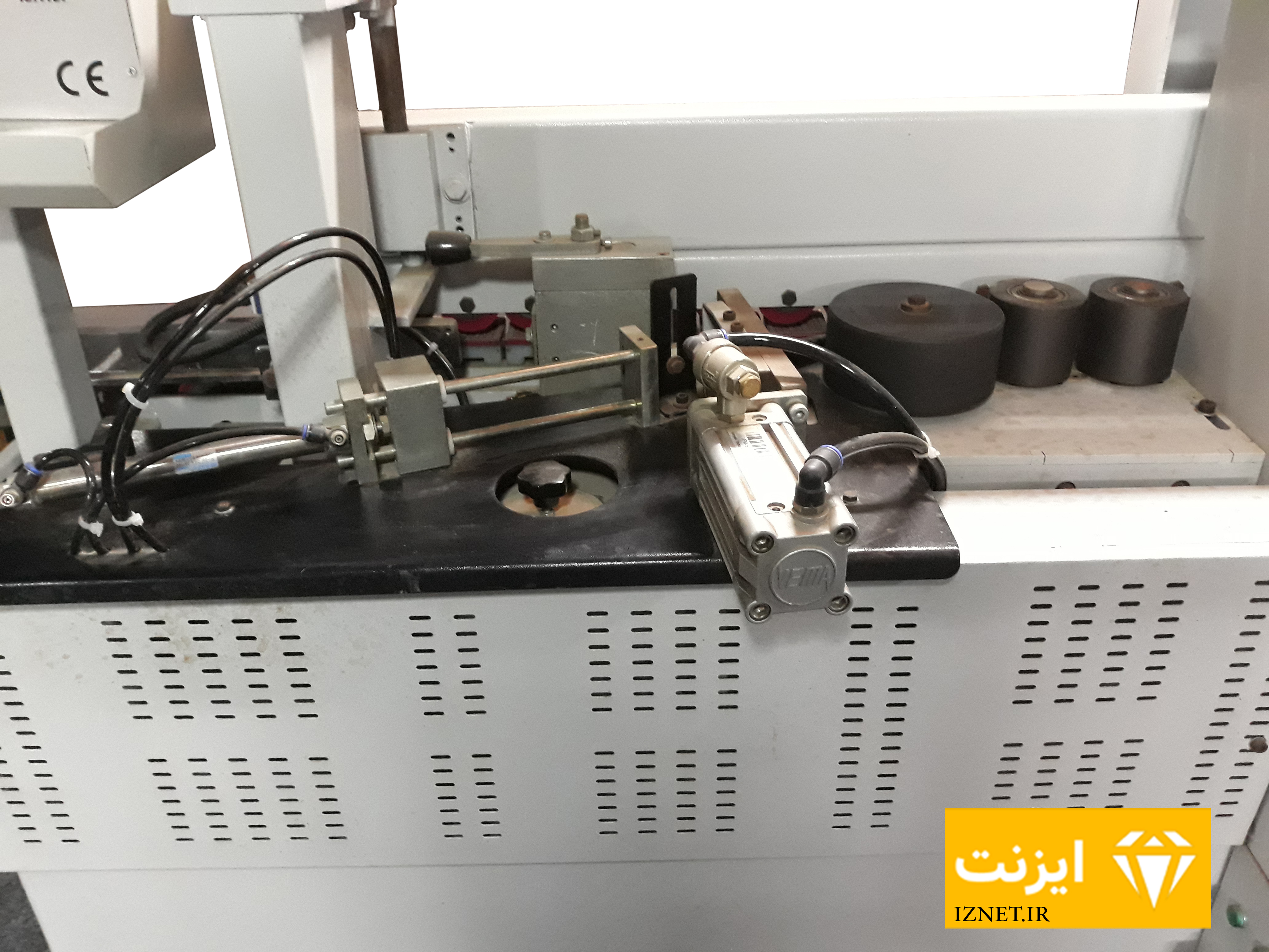 چسباندن :در این قسمت قطعه کار که به وسیله غلطک به جلو هدایت میشود تا سطح چوب اغشته به چسب گردد تا نوار به وسیله فشار غلطک به سطح کار بچسبد