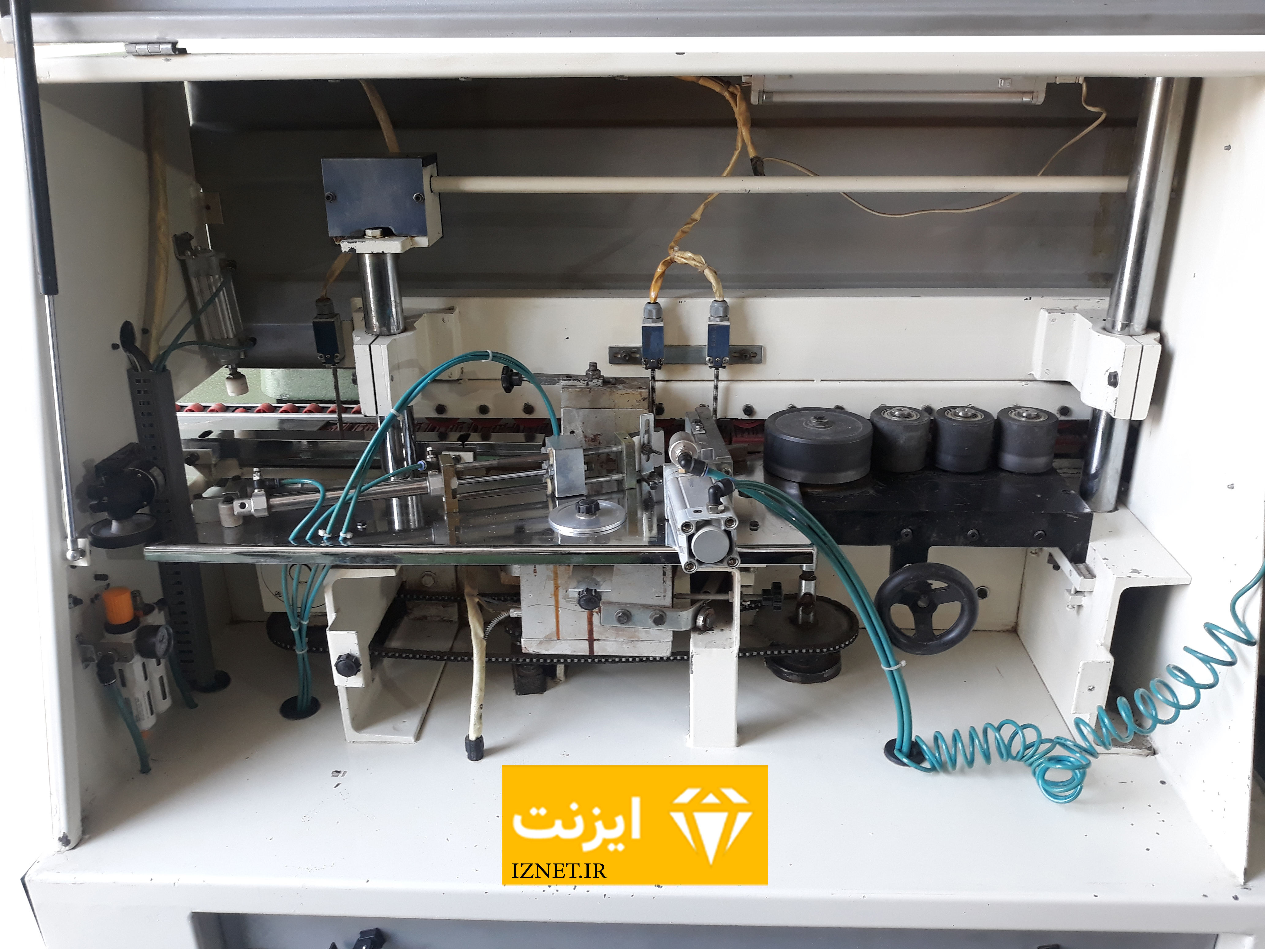 چسباندن :در این قسمت قطعه کار که به وسیله غلطک به جلو هدایت میشود تا سطح چوب اغشته به چسب گردد تا نوار به وسیله فشار غلطک به سطح کار بچسب